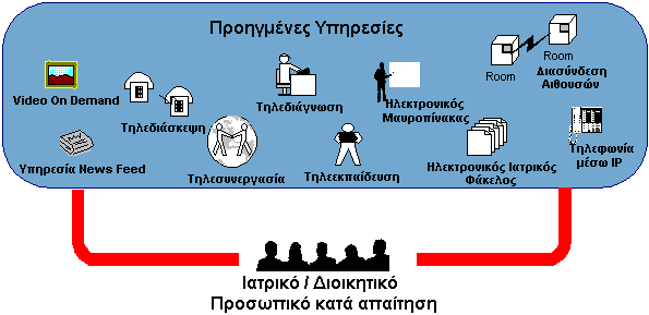 Οι προηγμένες υπηρεσίες περιλαμβάνουν κεντρικοποιημένα και κατανεμημένα συστήματα επικοινωνίας πολυμέσων τα οποία είναι σε θέση να υποστηρίζουν υπηρεσίες προστιθέμενης αξίας όπως η Τηλεκπαίδευση, η διασύνδεση αιθουσών διδασκαλίας, καθώς και εφαρμογές υποστήριξης τηλεϊατρικής και τηλεδιάγνωσης, και κατανεμημένα περιβάλλοντα εργασίας. Ενδεικτικά αναφέρονται οι υπηρεσίες εικονογραφίας κατά απαίτηση (Video On Demand), υπηρεσίες εκπομπής video και ήχου, εφαρμογές τηλεδιάσκεψης και τηλεργασίας, εργαλεία ΜΒΟΝΕ,  καθώς και υπηρεσίες μεταφοράς και αποθήκευσης  ιατρικών εικόνων. Στο παρακάτω σχήμα παρουσιάζονται οι υπηρεσίες αυτές.