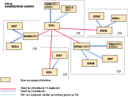 Στο παρακάτω σχήμα παρουσιάζεται ο τρόπος διασύνδεσης συστάδων μεταξύ τους, συμπεριλαμβανόμενων των κτιριακών ομαδοποιήσεων και του τύπου καλωδίου που σε κάθε περίπτωση χρησιμοποιείται. Όπως μπορεί επίσης να διαπιστωθεί, τα κτίρια ΚΤ04Α, ΚΤ14, ΚΤ16, ΚΤ18Β και ΚΤ20 χρησιμοποιούνται σαν “Κεντρικά Κτίρια Συστάδων” και συνδέονται μεταξύ τους (αλλά και με τα λοιπά Περιφερειακά Κτίρια κάθε συστάδας) με οπτική ίνα.
